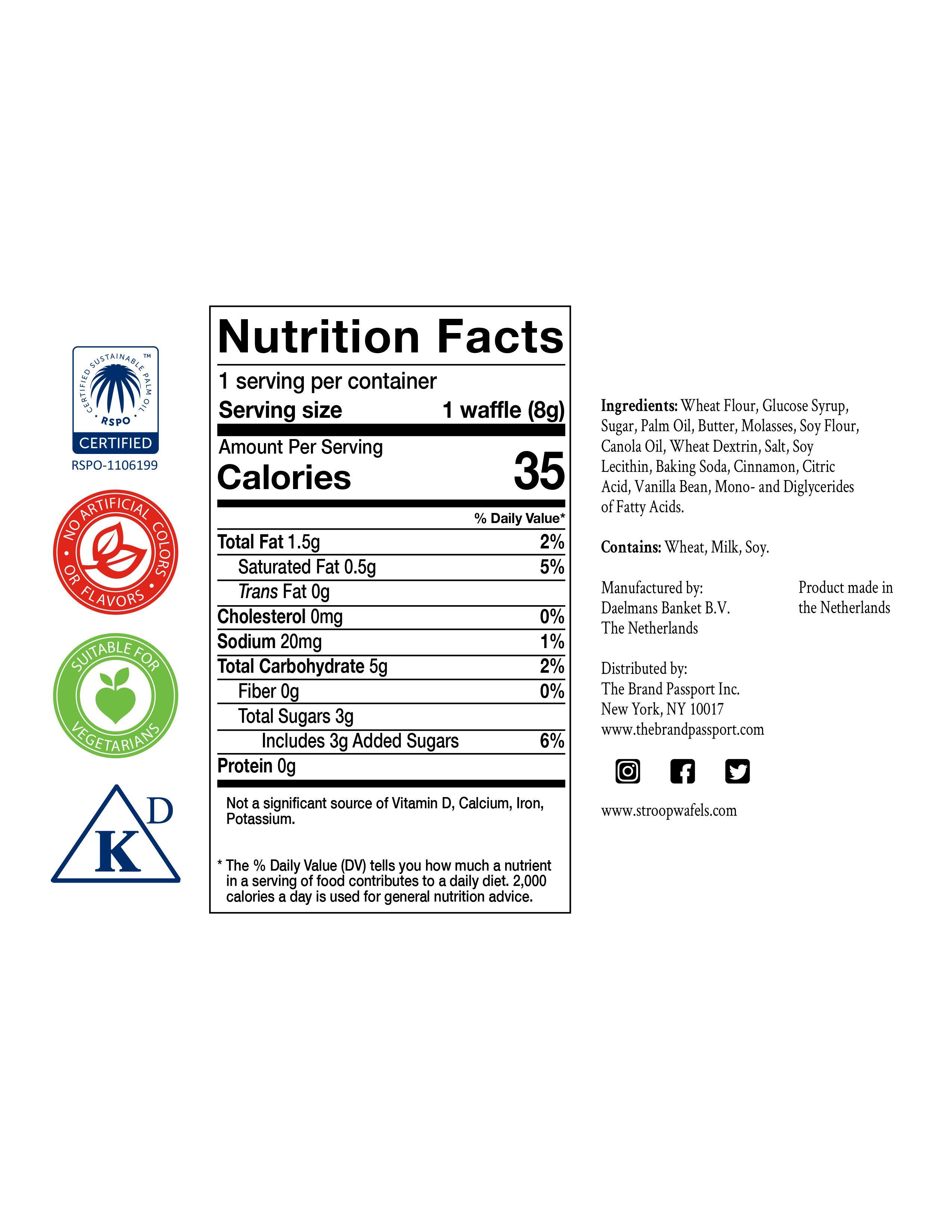- Made in The Netherlands- Vegetarian #### 200-Pack: Caramel Daelman’s Individually Wrapped Mini Soft Toasted Stroopwafels - Best by: 04/15/2022 - Ingredients: Wheat Flour, Glucose Syrup, Sugar, Palm Oil, Butter, Molasses, Soy Flour, Canola Oil, Wheat Dextrin, Salt, Soy Lecithin, Baking Soda, Cinnamon, Citric Acid, Vanilla Bean, Mono- and Diglycerides of Fatty Acids - Allergen information: Contains wheat, milk, and soy- Nutrition information#### 200-Pack: Honey Daelman’s Individually Wrapped Mini Soft Toasted Stroopwafels - Best by: 11/27/2022 - Ingredients: Wheat Flour, Glucose Syrup, Sugar, Butter, Palm Oil, Honey, Invert Sugar, Canola Oil, Soy Flour, Wheat Dextrin, Salt, Soy Lecithin, Baking Soda, Cinnamon, Citric Acid, Vanilla Bean, Mono- and Diglycerides of Fatty Acids - Allergen information: Contains wheat, milk, and soy- Nutrition information#### 200-Pack: Chocolate Daelman’s Individually Wrapped Mini Soft Toasted Stroopwafels - Best by: 12/14/2022 - Ingredients: Wheat Flour, Glucose Syrup, Sugar, Palm Oil, Butter, Molasses, Cocoa Powder, Soy Flour, Canola Oil, Salt, Wheat Dextrin, Natural Flavor, Baking Soda, Soy Lecithin, Citric Acid, Cinnamon, Vanilla Bean, Mono- and Diglycerides of Fatty Acids - Allergen information: Contains wheat, milk, and soy- Nutrition information### Whats Included?200x Daelman’s Individually Wrapped Mini Soft Toasted Stroopwafels